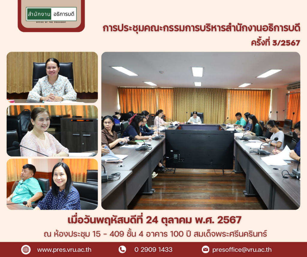 นางนิธิวดี ตั้งจันทร์สุข ผู้อำนวยการสำนักงานอธิการบดี เป็นประธานการประชุมคณะกรรมการบริหารสำนักงานอธิการบดี ครั้งที่ 3/2567 โดยมีนางวิไลลักษณ์ พงษ์แพทย์ ผู้อำนวยการกองกลาง น.ส.ภกพร ยอดหาญธิติกร ผู้ปฏิบัติหน้าที่ผู้อำนวยการ กองพัฒนานักศึกษา หัวหน้างานกองกลาง และบุคลากรสำนักงานอธิการบดี เข้าร่วมประชุมอย่างพร้อมเพรียง เมื่อวันที่ 24 ตุลาคม 2567 ณ ห้องประชุมบัณฑิตวิทยาลัย 15 – 409 ชั้น 4 อาคาร 100 ปี สมเด็จพระศรีนครินทร์